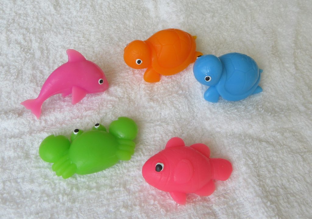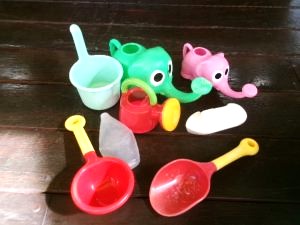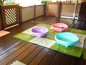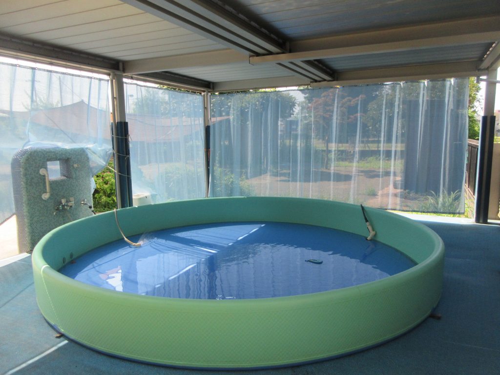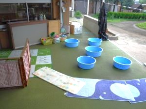 乳児はタライに入ったり、タライの外から中の水に触れてあそびます。水あそびの遊具も沢山あって、その中から自分の気に入った物を選んであそんでいます。遊具を使ってあそぶことはもちろん 桶に氷やお湯を入れて、手で触れてみたり、その感触の違いを経験したりしました。