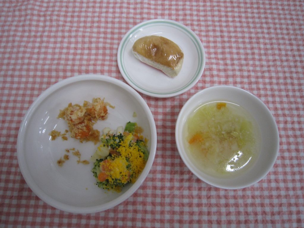 豆乳パン 鮭のフライ ブロッコリーミモザサラダ 野菜スープ